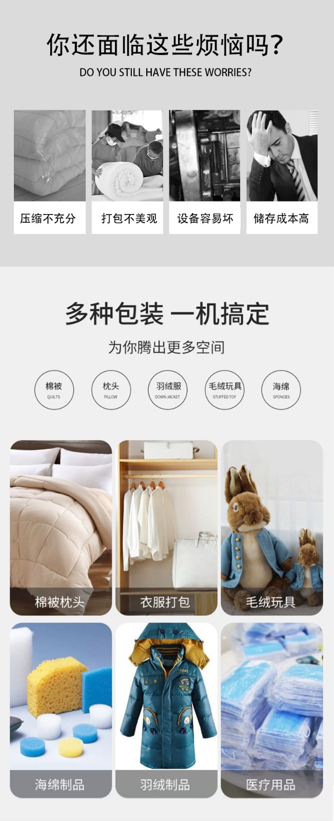 真空壓縮封口機:集成抽真空功能,先抽走包裝內空氣(如食品袋、零件袋),再加壓封口,適合需要防潮、保鮮、防氧化的場景(如肉類真空包裝、精密零件防銹包裝)。