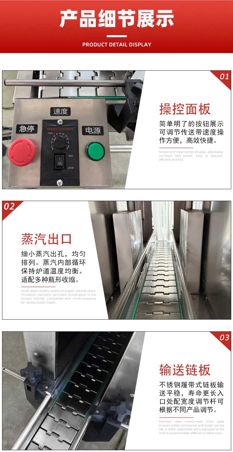 - 輸送系統(tǒng):用于平穩(wěn)傳送待包裝的產(chǎn)品,使其能在收縮室內(nèi)均勻接受蒸汽作用。